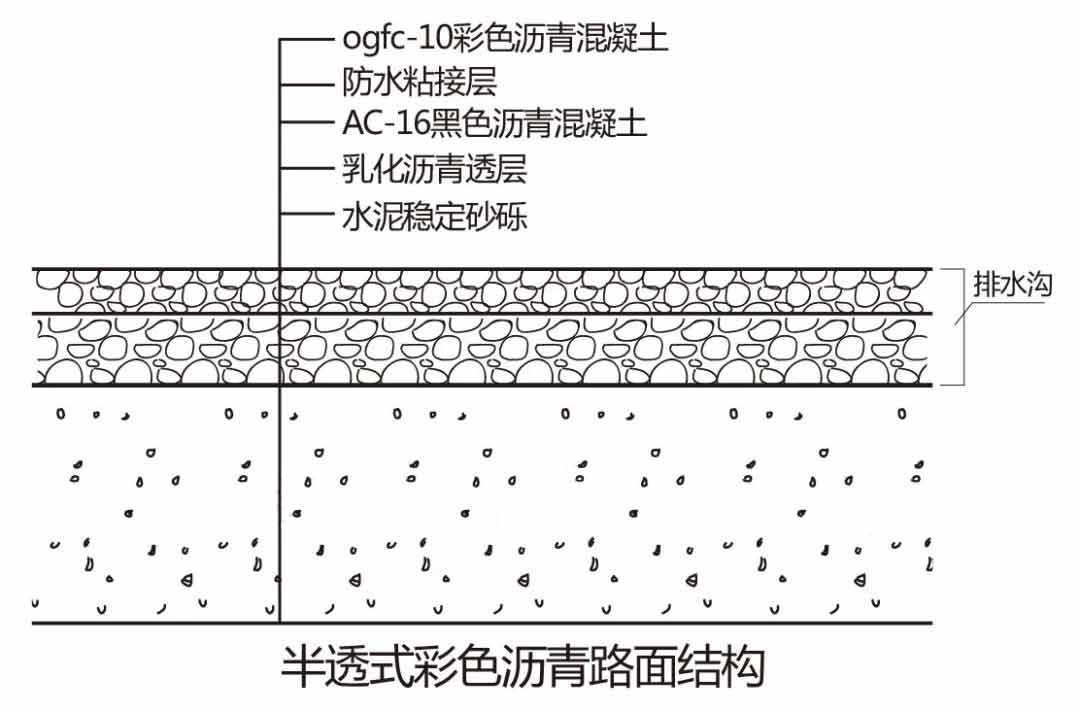 因工程慣例與實踐,國內(nèi)常用的彩色地面多為排水式的半透式地面,即地表降水透過排水瀝青表層沿下面層頂面排至兩側(cè)泄走。為保護地面下層結(jié)構(gòu),透水彩色瀝青面層地面需設(shè)置防水黏結(jié)層,以防雨水腎透支下層結(jié)構(gòu)層中破壞路基。雨水通過透水表層并沿橫坡或縱坡排向路側(cè)排水設(shè)施,為增強排水功能多采用預(yù)埋橫向或縱向排水管或排水溝的形式將水排走。