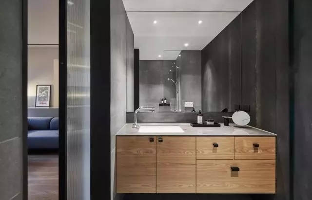 衛(wèi)生間做成干濕分離,同樣也用黑框的玻璃來做隔斷,浴室柜也是多功能的,一側(cè)洗漱,一側(cè)還是一個梳妝臺,一個人或者是兩個人的空間,這是大多數(shù)人追求的舒適生活了吧!