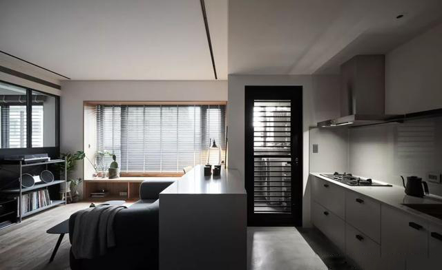 整個空間做成開放式的格局,基本就是黑色、白色、灰色、原木,再無其他艷麗的色彩了。入戶玄關(guān)地面開始就做水泥自流平地面,以及客廳臥室直接過渡成地板。